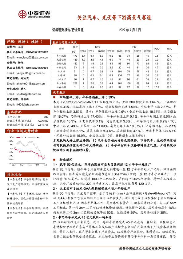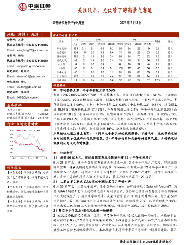 【中泰证券】【20220703】电子行业周报:关注汽车、光伏等下游高景气赛道-13页