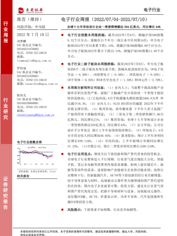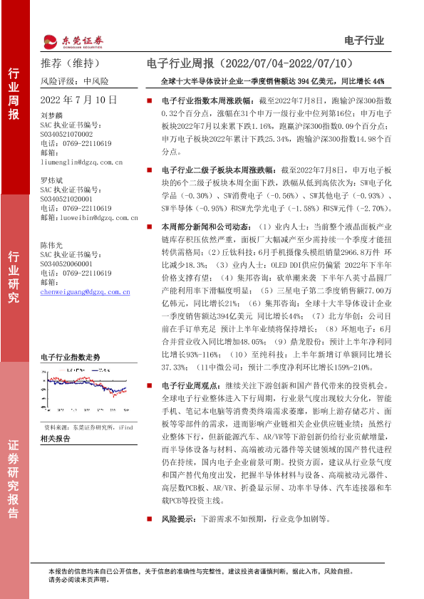 【东莞证券】【20220710】20220710-东莞证券-电子行业周报:全球十大半导体设计企业一季度销售额达394亿美元,同比增长44%-13页