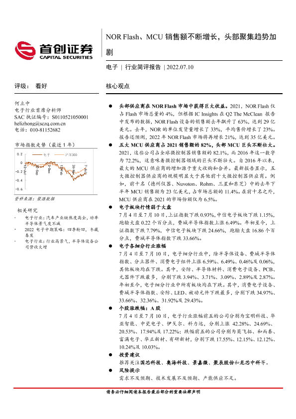 【首创证券】【20220710】20220710-首创证券-电子行业简评报告:NOR Flash、MCU销售额不断增长,头部聚集趋势加剧-10页