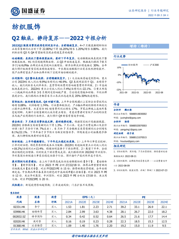 【国盛证券】【20220904】纺织服饰行业2022中报分析:Q2触底,静待复苏-35页