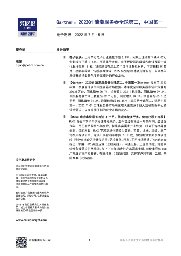 【莫尼塔研究】【20220715】20220715-莫尼塔投资-电子周报:Gartner:2022Q1浪潮服务器全球第二,中国第一-6页