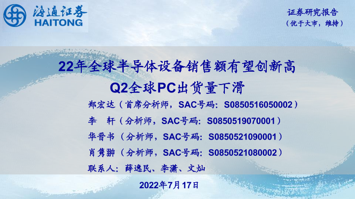 【海通证券】【20220717】22年全球半导体设备销售额有望创新高 Q2全球PC出货量下滑-10页