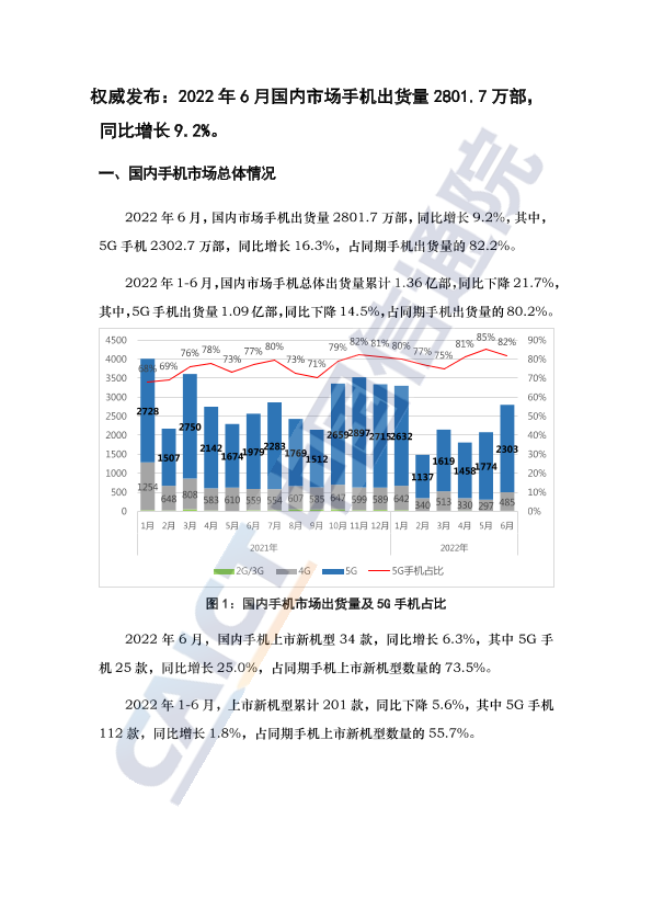 【中国信通院】【20220721】权威发布:2022年6月国内市场手机出货量2801.7万部,同比增长9.2%-3页