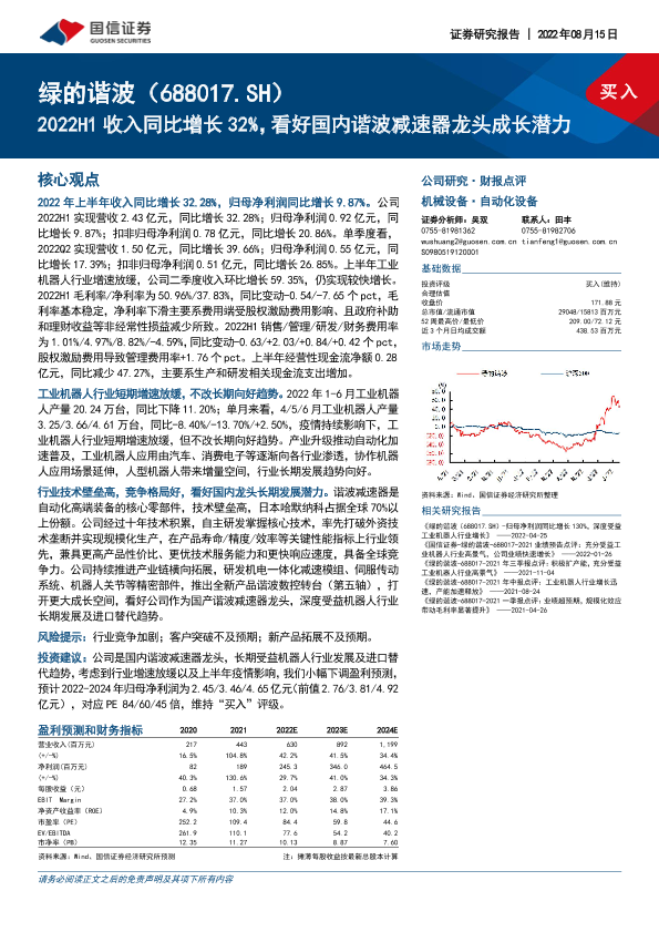 【国信证券】【20220815】绿的谐波-688017-2022H1收入同比增长32%,看好国内谐波减速器龙头成长潜力-6页