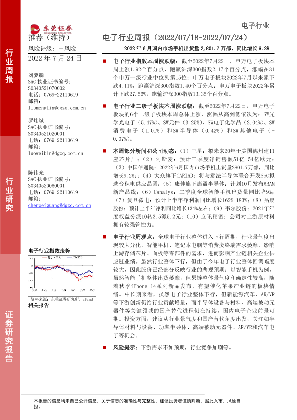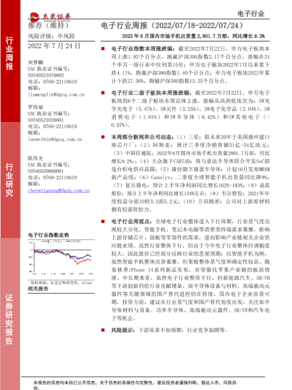 【东莞证券】【20220724】20220724-东莞证券-电子行业周报:2022年6月国内市场手机出货量2,801.7万部,同比增长9.2%-12页