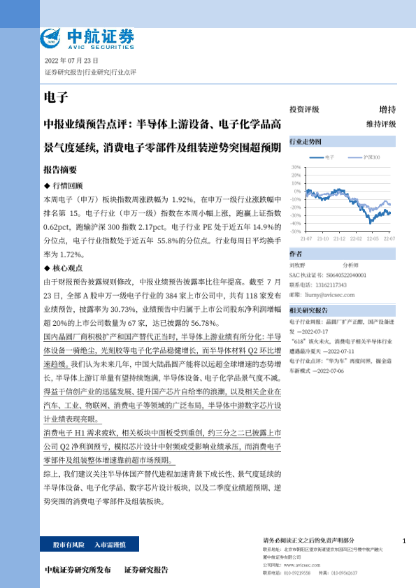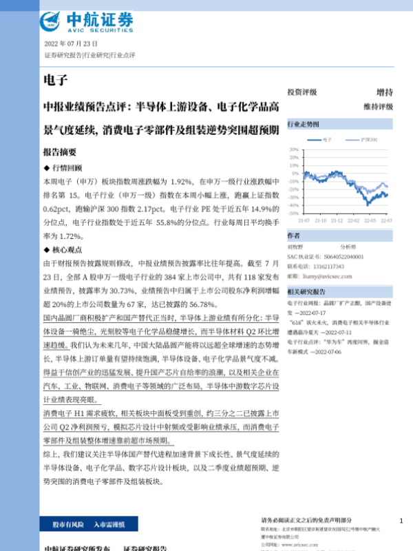 【中航证券】【20220723】电子中报业绩预告点评:半导体上游设备、电子化学品高景气度延续,消费电子零部件及组装逆势突围超预期-17页