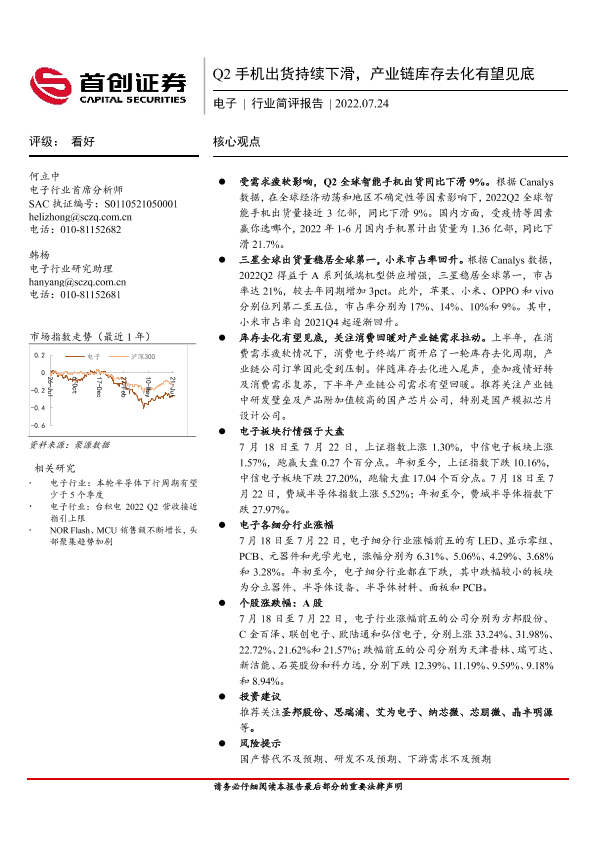 【首创证券】【20220724】20220724-首创证券-电子行业简评报告:Q2手机出货持续下滑,产业链库存去化有望见底-10页