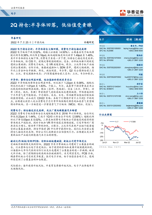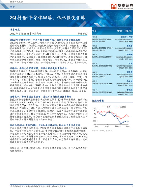 【华泰证券】【20220725】20220725-华泰证券-电子行业专题研究:2Q持仓:半导体回落,低估值受青睐-10页