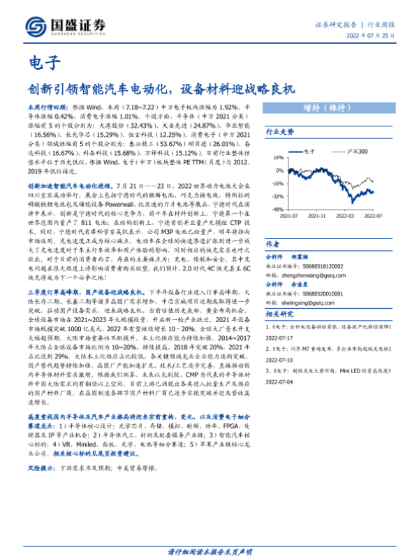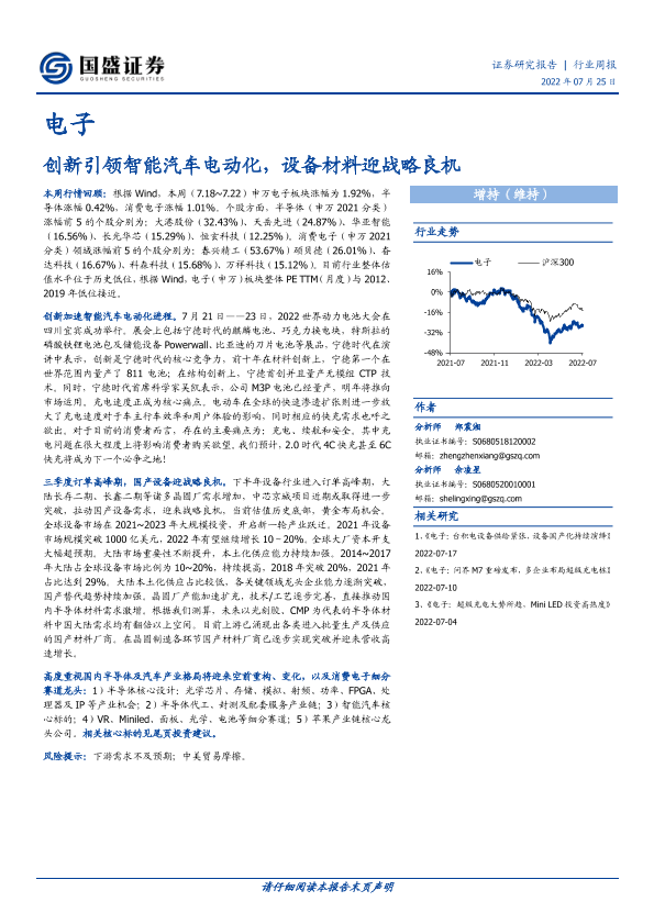 【国盛证券】【20220725】电子行业周报:创新引领智能汽车电动化,设备材料迎战略良机-20页