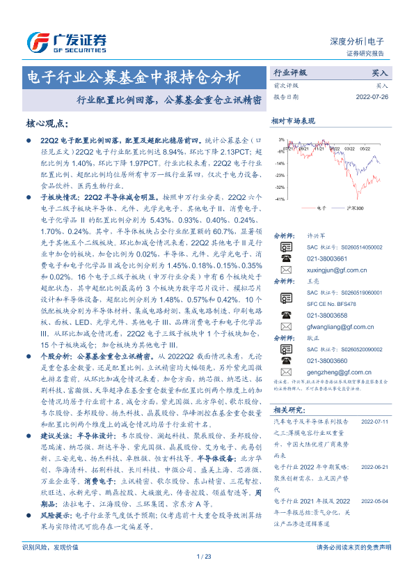 【广发证券】【20220726】电子行业公募基金中报持仓分析:行业配置比例回落,公募基金重仓立讯精密-23页