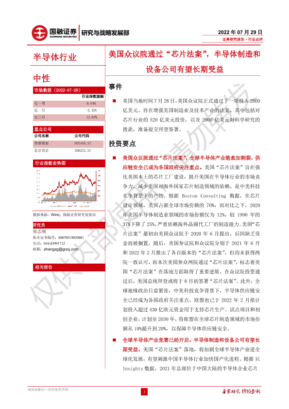 【国融证券】【20220729】半导体行业:美国众议院通过“芯片法案”,半导体制造和设备公司有望长期受益-3页