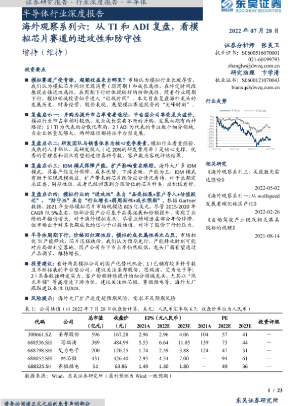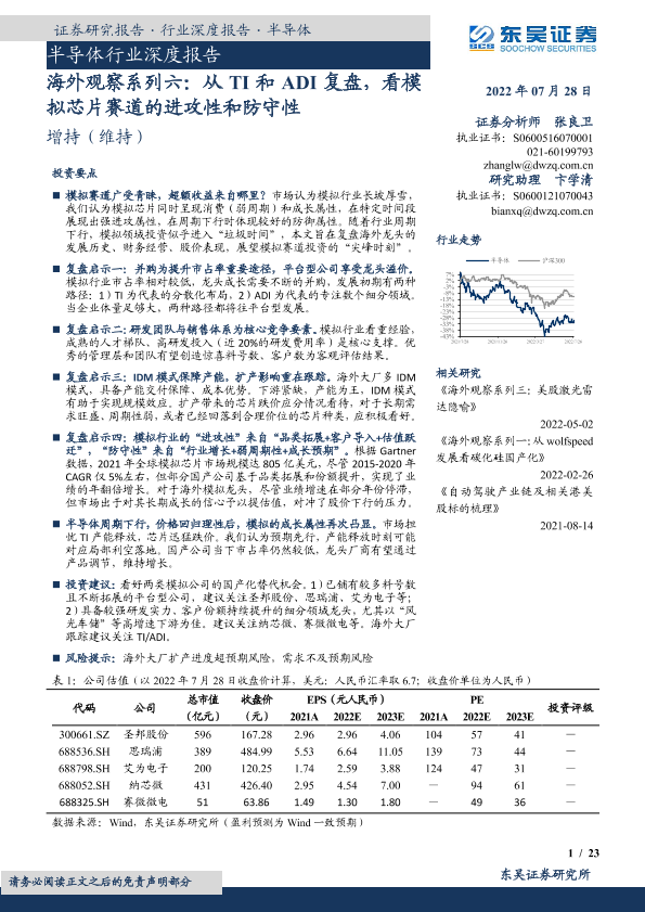 【东吴证券】【20220728】20220728-东吴证券-半导体行业深度报告:海外观察系列六:从TI和ADI复盘,看模拟芯片赛道的进攻性和防守性-23页