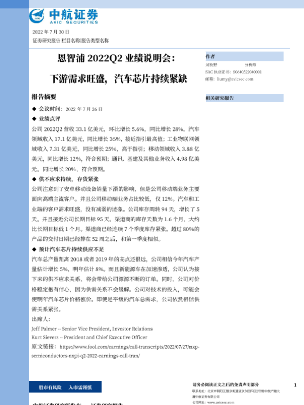 【中航证券】【20220730】恩智浦2022Q2业绩说明会:下游需求旺盛,汽车芯片持续紧缺-10页