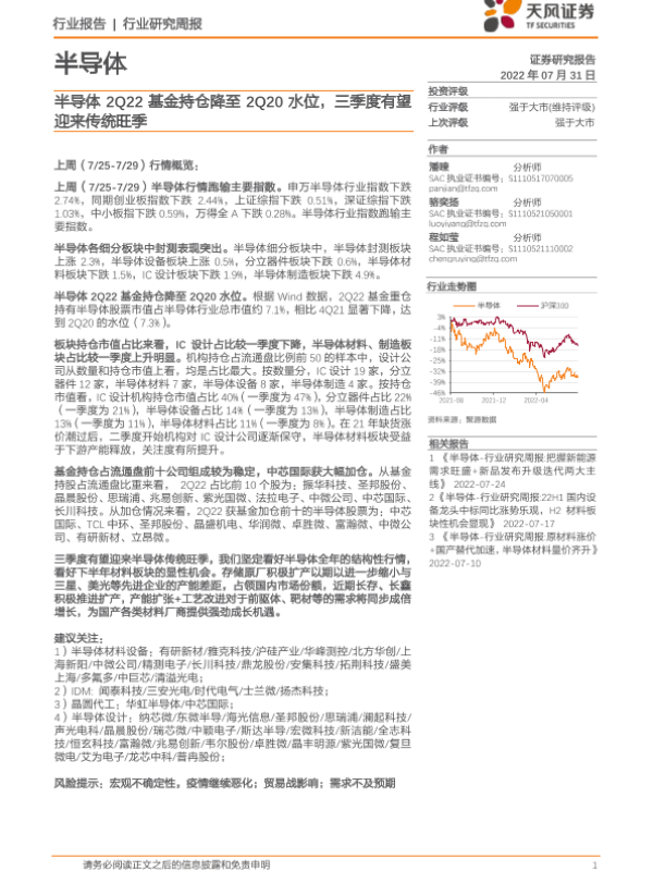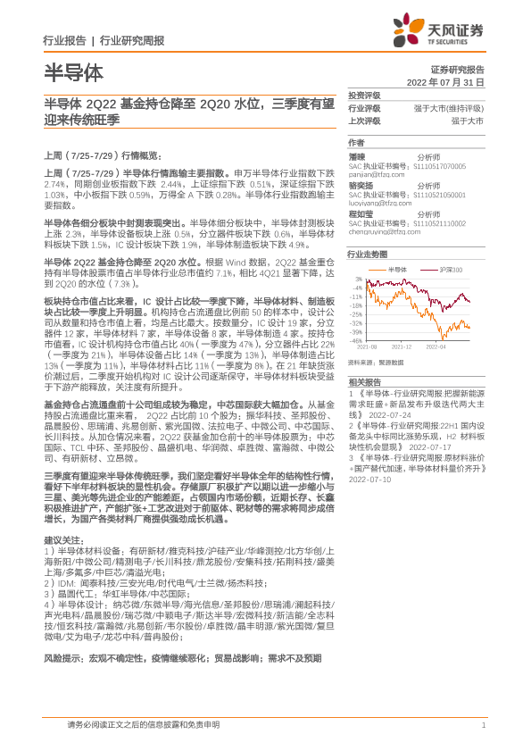 【天风证券】【20220731】20220731-天风证券-半导体行业研究周报:半导体2Q22基金持仓降至2Q20水位,三季度有望迎来传统旺季-9页