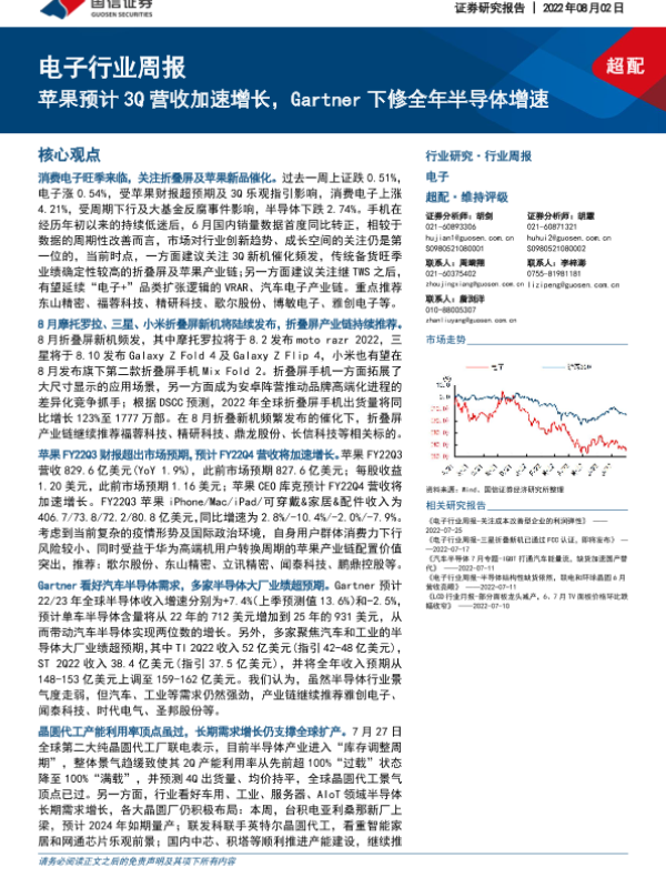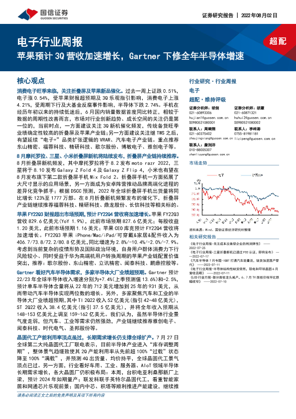 【国信证券】【20220802】电子行业周报:苹果预计3Q营收加速增长,Gartner下修全年半导体增速-13页