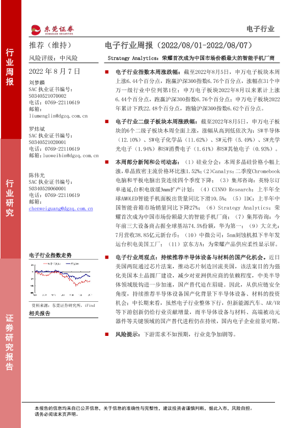【东莞证券】【20220807】电子行业周报:Strategy Analytics:荣耀首次成为中国市场份额最大的智能手机厂商-13页