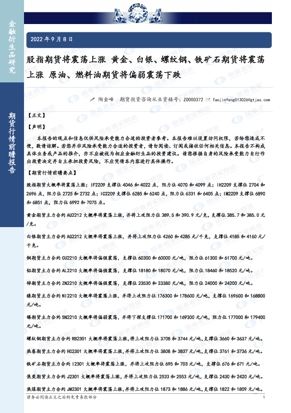 【国泰君安期货】【20220908】股指期货将震荡上涨,黄金、白银、螺纹钢、铁矿石期货将震荡上涨,原油、燃料油期货将偏弱震荡下跌-37页
