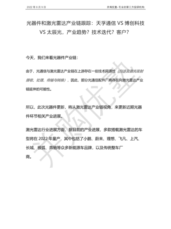 【并购优塾】【20220809】光器件和激光雷达产业链跟踪:天孚通信VS博创科技VS太辰光,产业趋势?技术迭代?客户?-25页