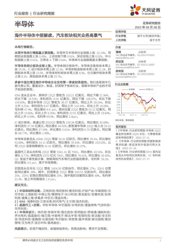 【天风证券】【20220808】20220808-天风证券-半导体行业研究周报:海外半导体中报解读,汽车板块相关业务高景气-16页