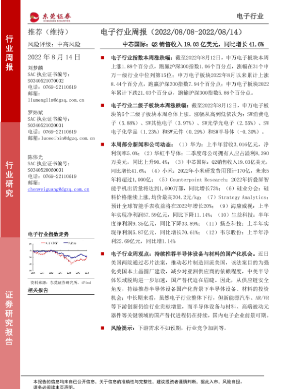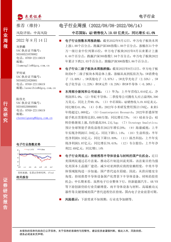 【东莞证券】【20220814】电子行业周报:中芯国际:Q2销售收入19.03亿美元,同比增长41.6%-13页