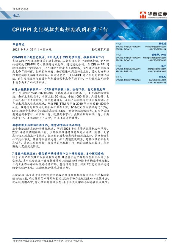 【华泰证券】【20210705】量化投资月报:CPI~PPI变化规律判断短期我国利率下行-22页