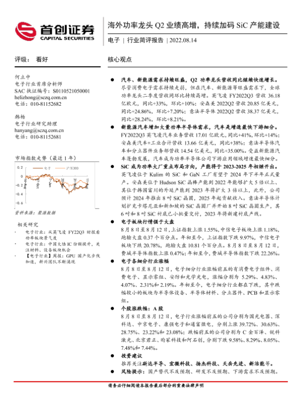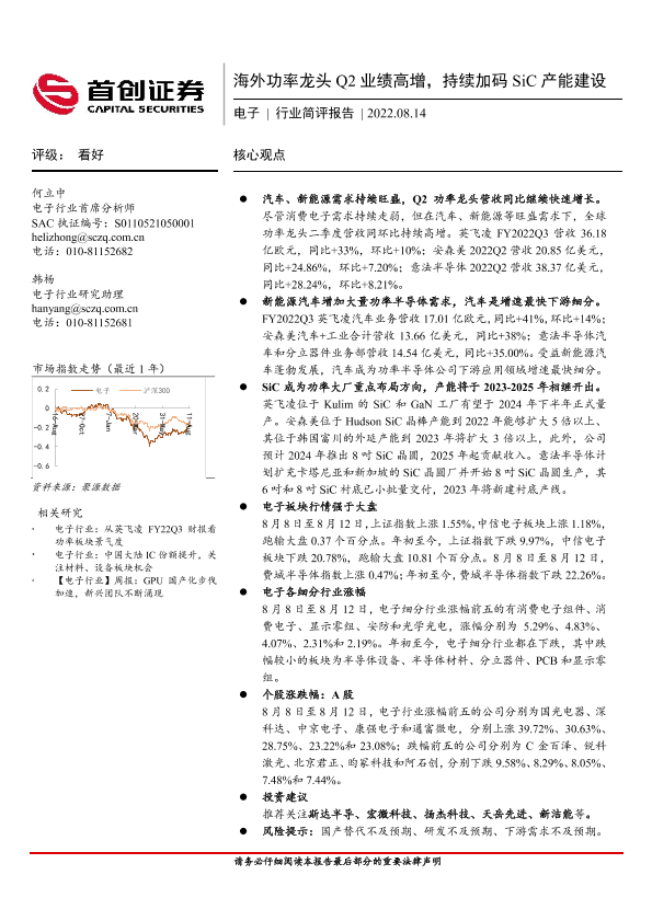 【首创证券】【20220814】20220814-首创证券-电子行业简评报告:海外功率龙头Q2业绩高增,持续加码SiC产能建设-11页