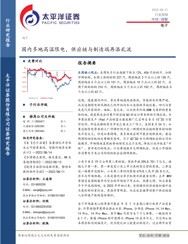 【太平洋证券】【20220821】电子行业周报:国内多地高温限电,供应链与制造端再添乱流-15页