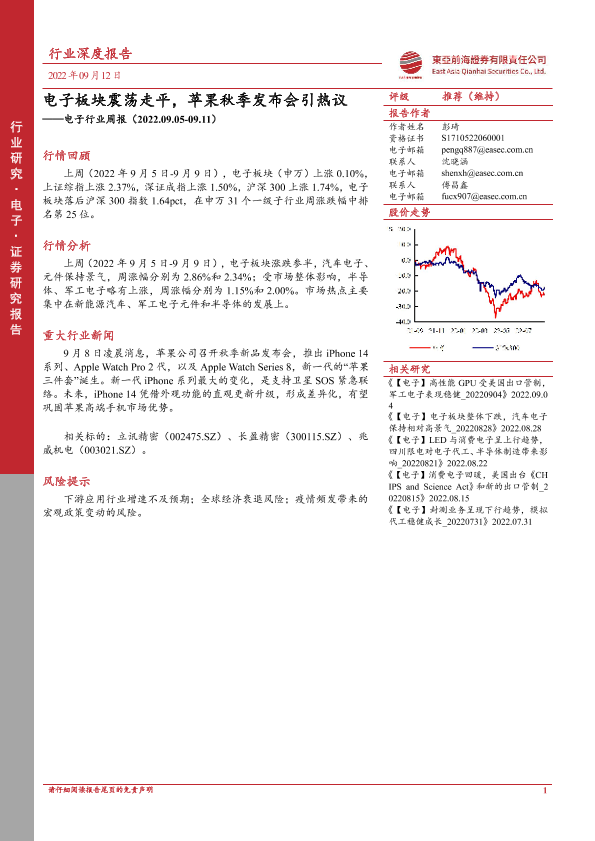 【东亚前海证券】【20220912】电子行业周报:电子板块震荡走平,苹果秋季发布会引热议-8页
