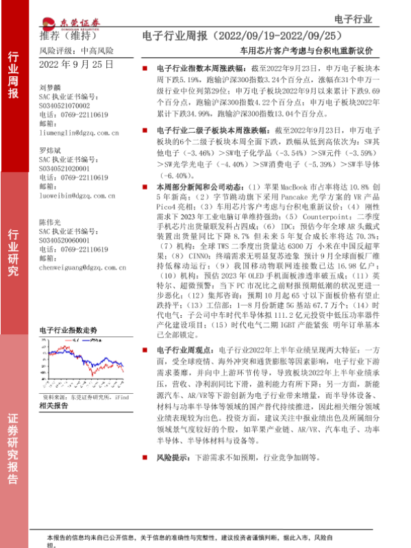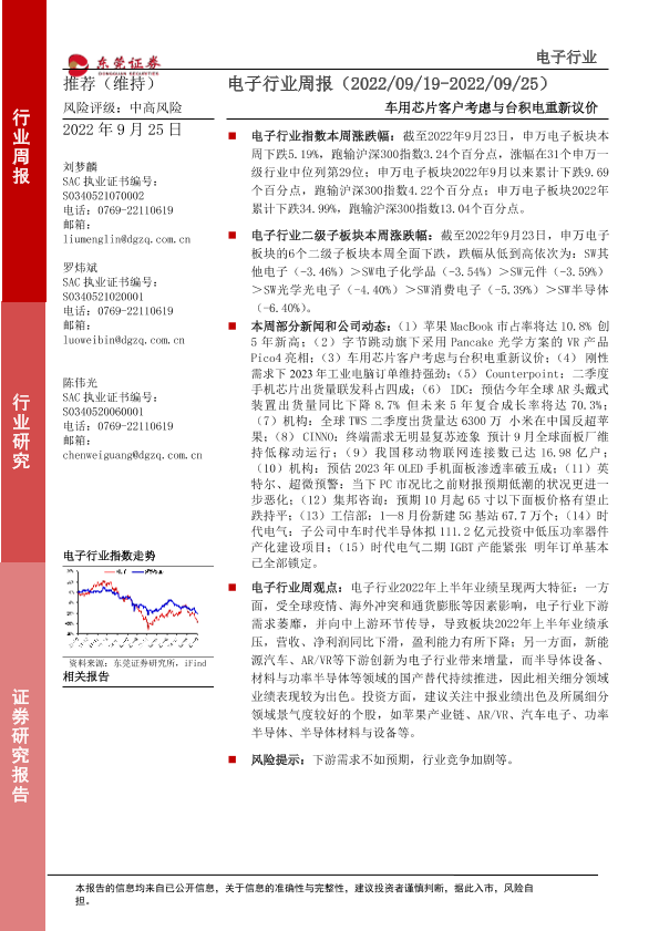 【东莞证券】【20220925】电子行业周报:车用芯片客户考虑与台积电重新议价-12页