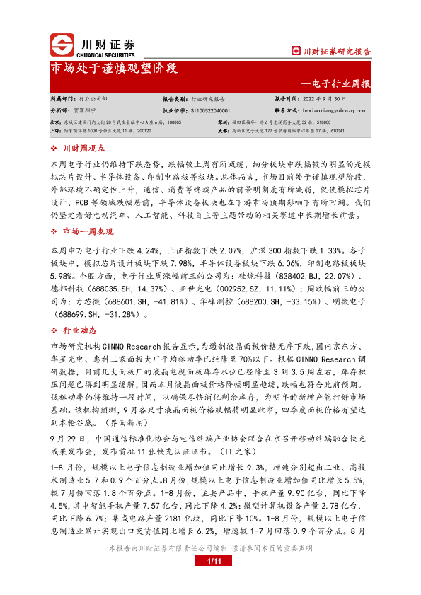 【川财证券】【20220930】20220930-川财证券-电子行业周报:市场处于谨慎观望阶段-11页