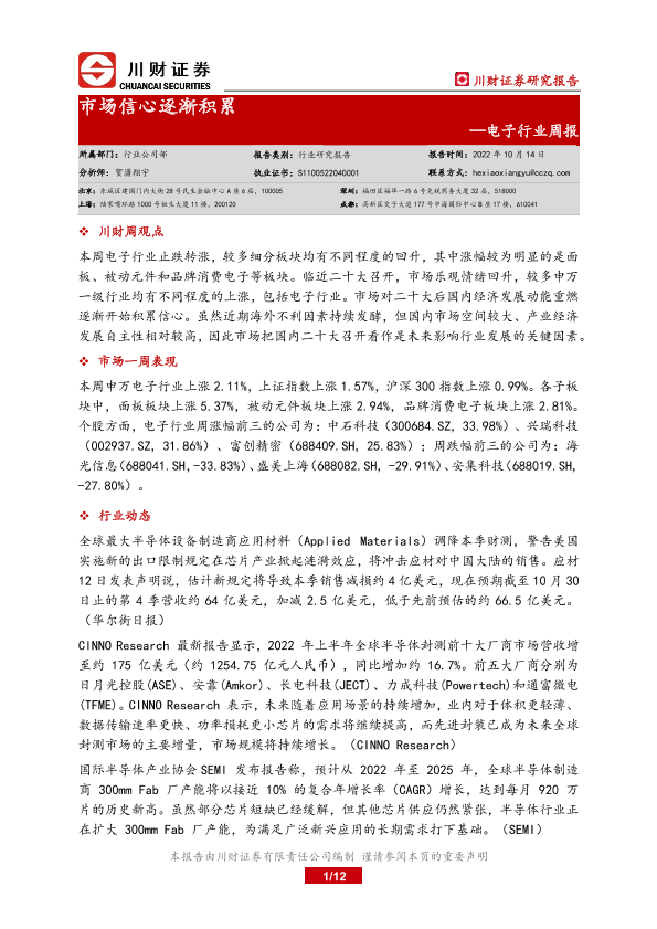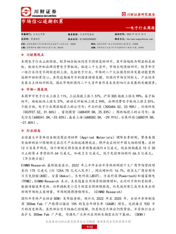 【川财证券】【20221014】电子行业周报:市场信心逐渐积累-12页