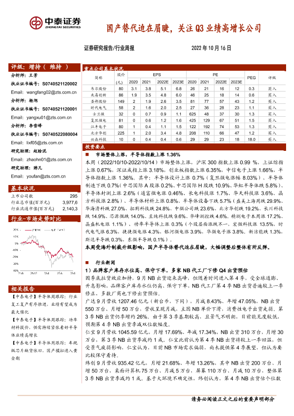 【中泰证券】【20221016】20221016-中泰证券-电子行业周报:国产替代迫在眉睫,关注Q3业绩高增长公司-14页