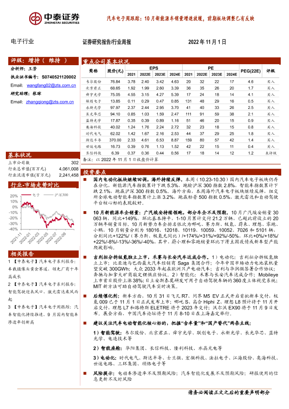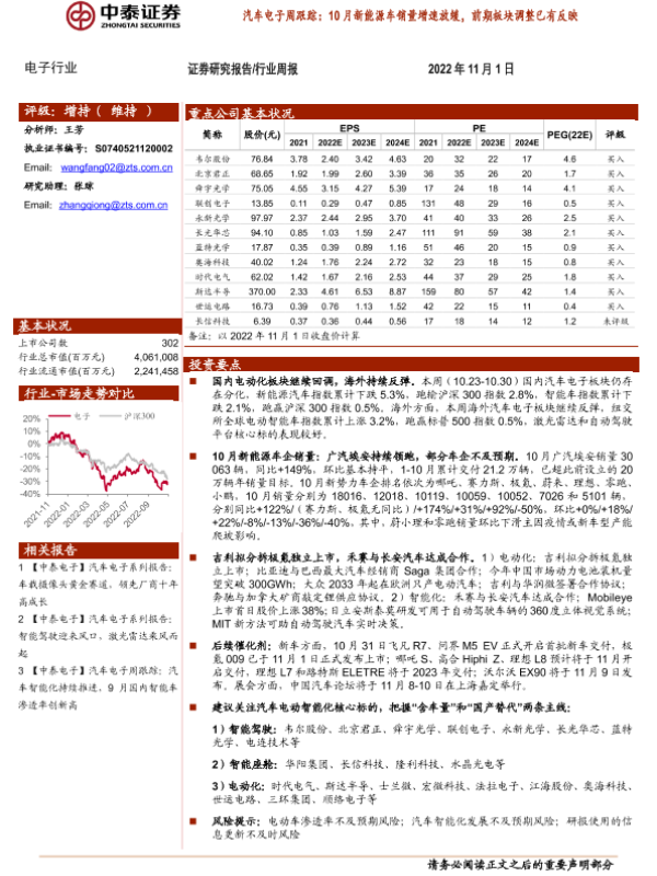 【中泰证券】【20221101】汽车电子周跟踪:10月新能源车销量增速放缓,前期板块调整已有反映-16页