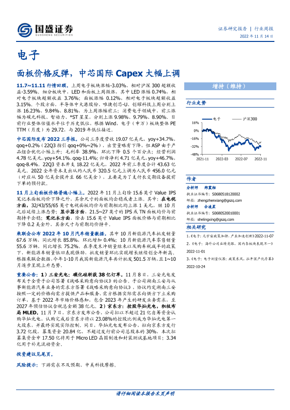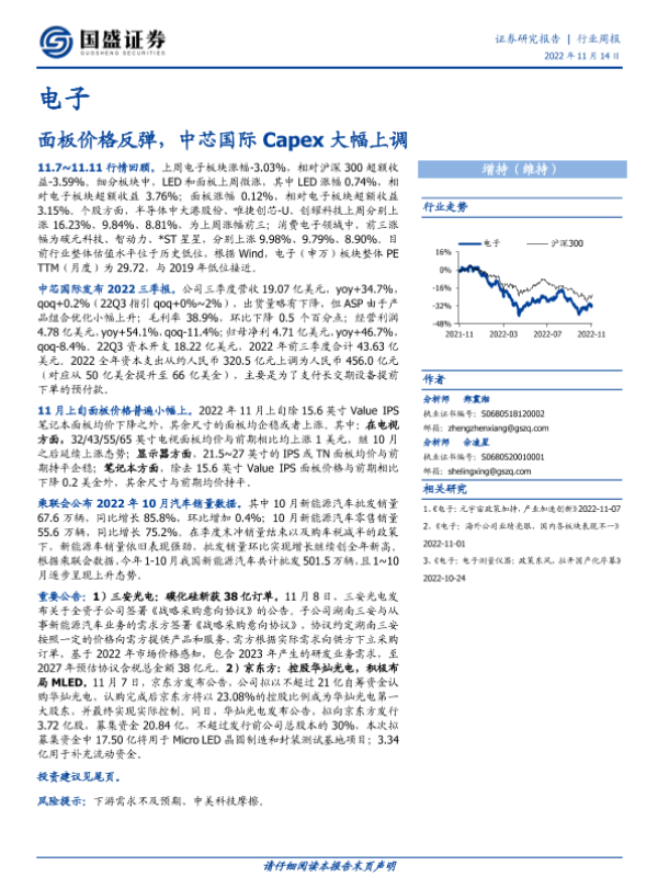 【国盛证券】【20221114】电子行业周报:面板价格反弹,中芯国际Capex大幅上调-16页