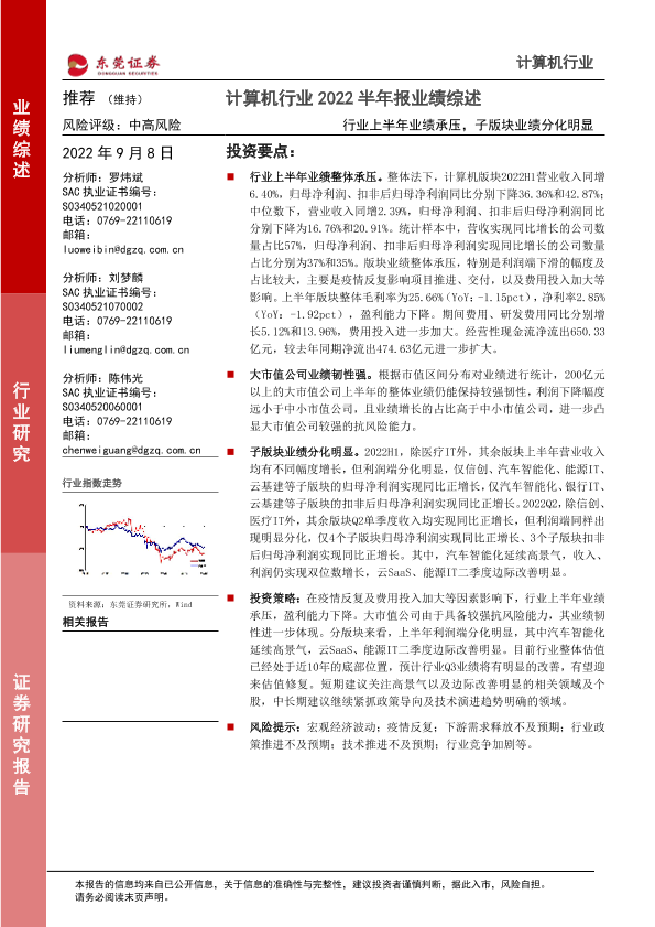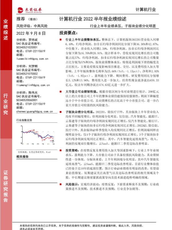 【东莞证券】【20220908】计算机行业2022半年报业绩综述:行业上半年业绩承压,子版块业绩分化明显-18页