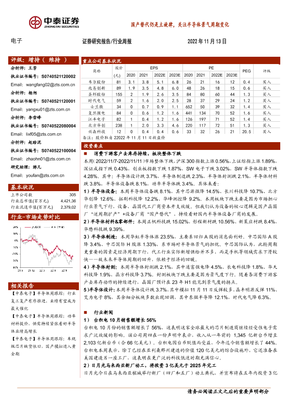 【中泰证券】【20221113】20221113-中泰证券-电子行业周报:国产替代仍是主旋律,关注半导体景气周期变化-14页