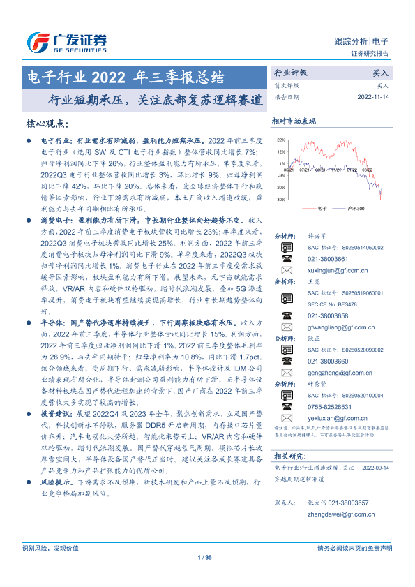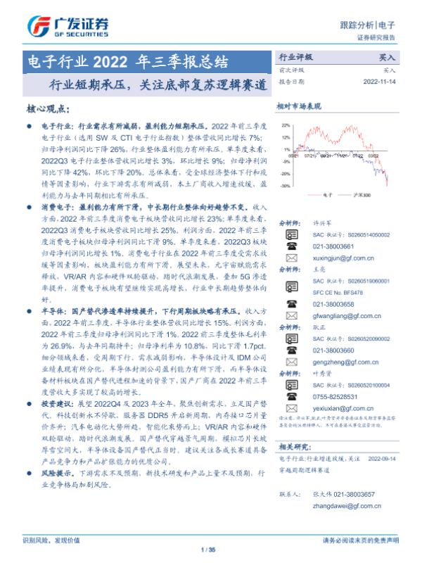 【广发证券】【20221114】电子行业2022年三季报总结:行业短期承压,关注底部复苏逻辑赛道-35页