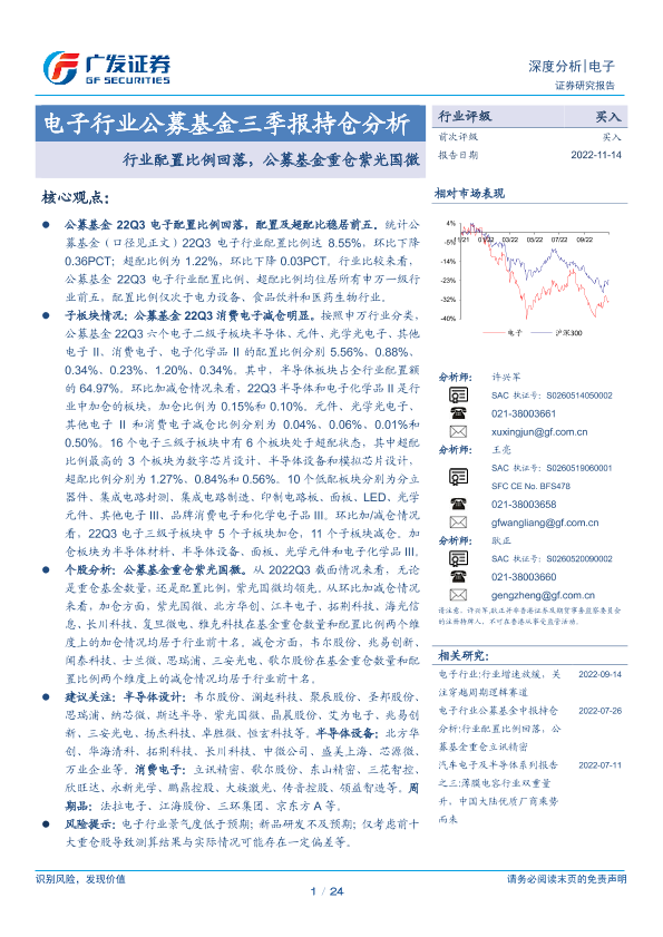 【广发证券】【20221114】电子行业公募基金三季报持仓分析:行业配置比例回落,公募基金重仓紫光国微-24页