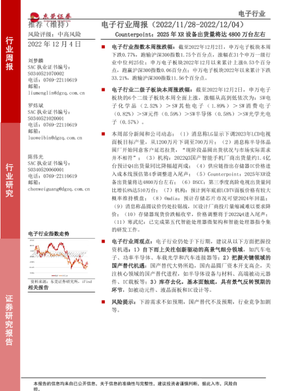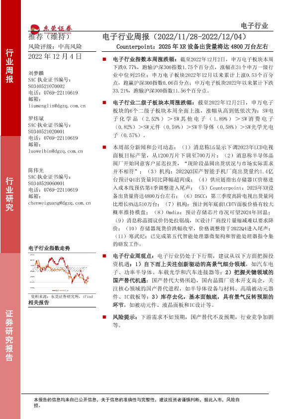 【东莞证券】【20221204】20221204-东莞证券-电子行业周报:Counterpoint:2025年XR设备出货量将达4800万台左右-11页