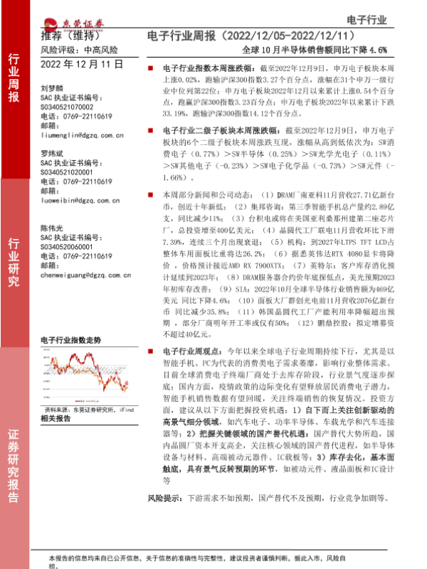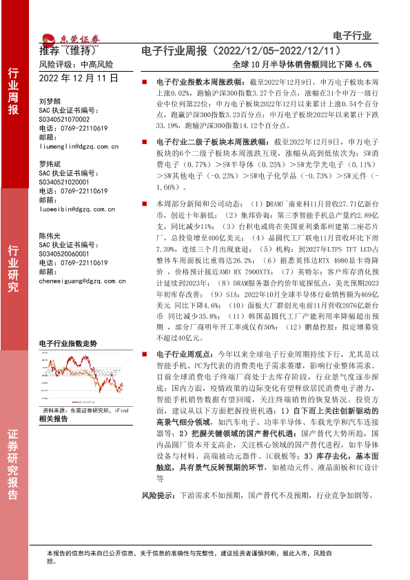 【东莞证券】【20221211】电子行业周报:全球10月半导体销售额同比下降4.6%-11页