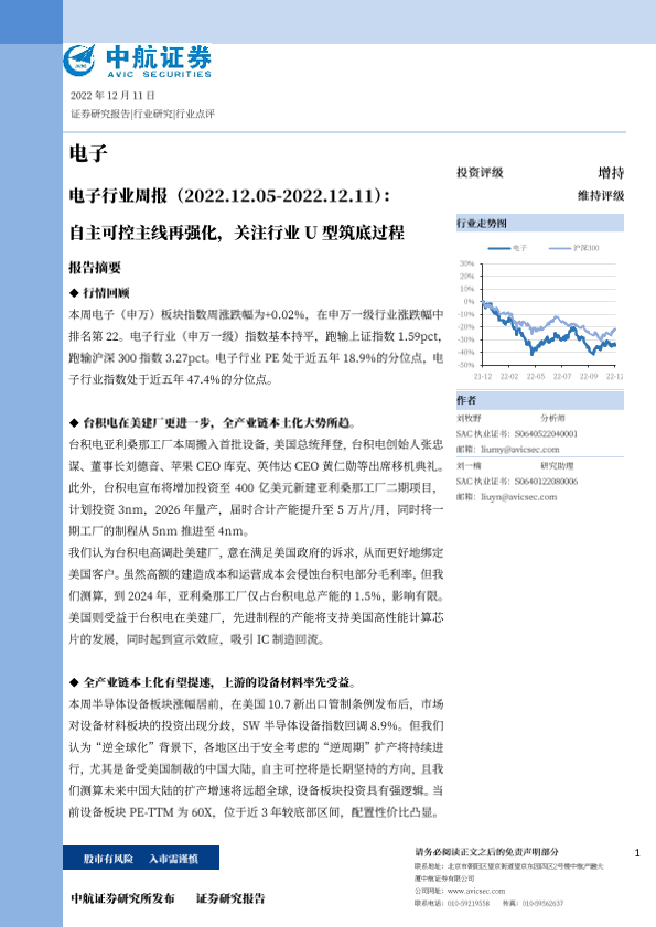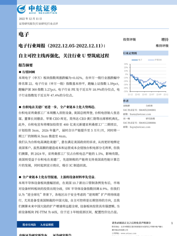 【中航证券】【20221211】20221211-中航证券-电子行业周报:自主可控主线再强化,关注行业U型筑底过程-15页