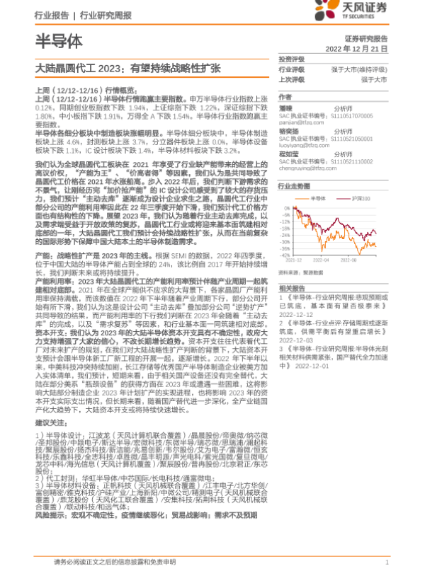 【天风证券】【20221221】半导体行业研究周报:大陆晶圆代工2023:有望持续战略性扩张-12页