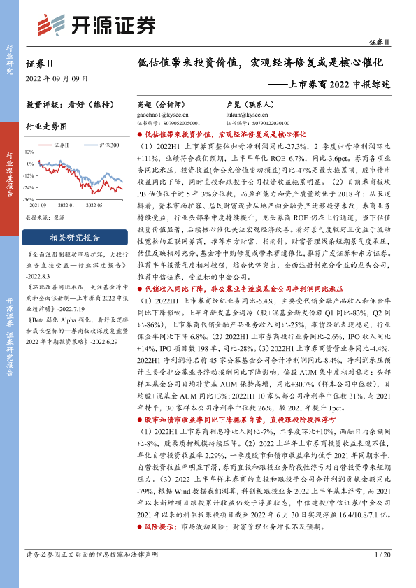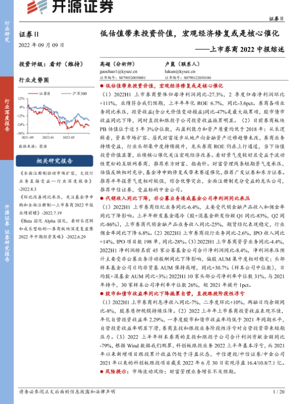 【开源证券】【20220909】证券Ⅱ行业上市券商2022中报综述:低估值带来投资价值,宏观经济修复或是核心催化-20页