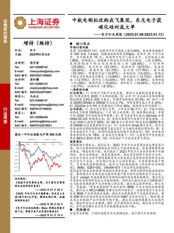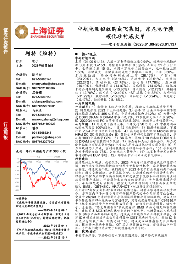 【上海证券】【20230116】20230116-上海证券-电子行业周报:中航电测拟收购成飞集团,东尼电子获碳化硅衬底大单-10页