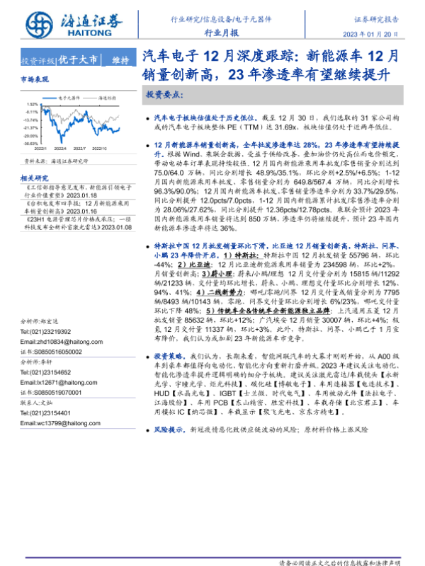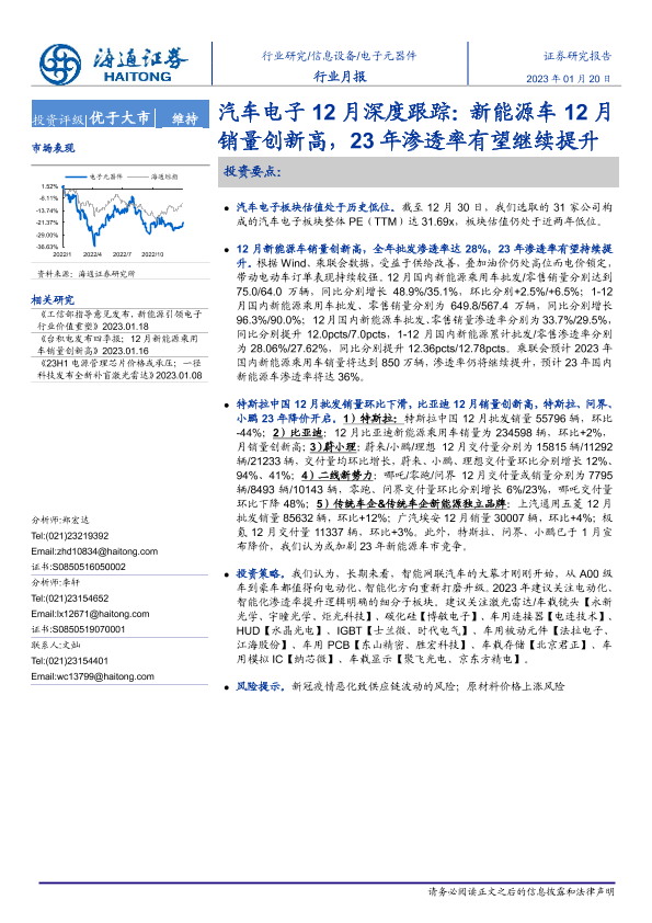 【海通证券】【20230120】汽车电子12月深度跟踪:新能源车12月销量创新高,23年渗透率有望继续提升-14页