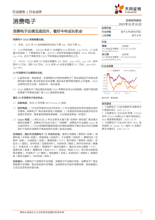【天风证券】【20230203】消费电子行业点评:消费电子业绩见底回升,看好今年成长机会-11页