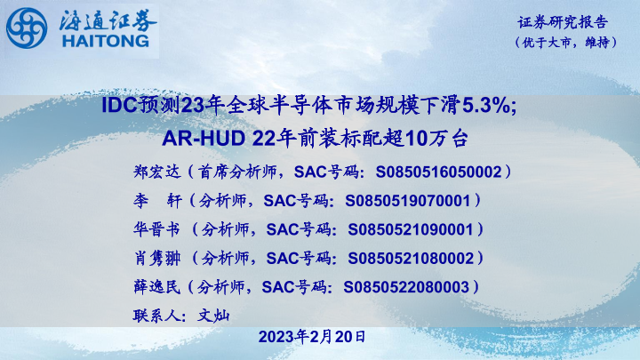 【海通证券】【20230220】IDC预测23年全球半导体市场规模下滑5.3%;AR-HUD22年前装标配超10万台-10页