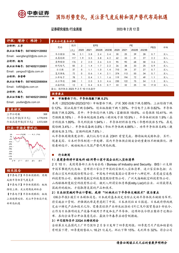 【中泰证券】【20230212】20230212-中泰证券-半导体行业周报:国际形势变化,关注景气度反转和国产替代布局机遇-15页