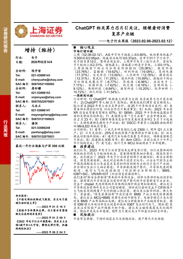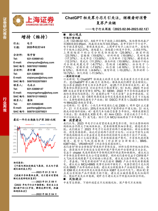 【上海证券】【20230214】20230214-上海证券-电子行业周报:ChatGPT相关算力芯片引关注,继续看好消费复苏产业链-16页