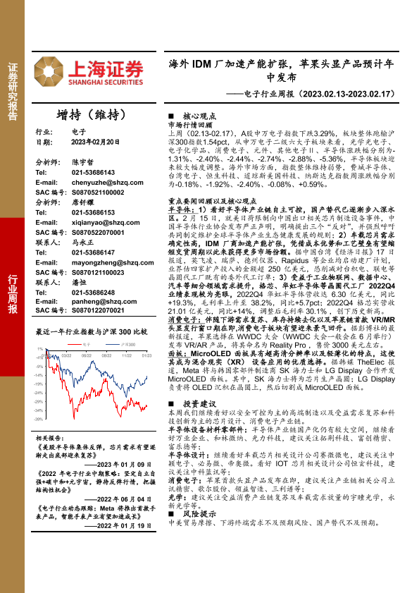 【上海证券】【20230220】电子行业周报:海外IDM厂加速产能扩张,苹果头显产品预计年中发布-12页